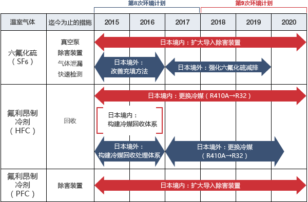 为综合评估和管理对全球暖化的影响,继第8次环境计划,推进“削减能源CO2”和“CO2以外的温室气体(SF6、HFC、PFC)”的相应活动。